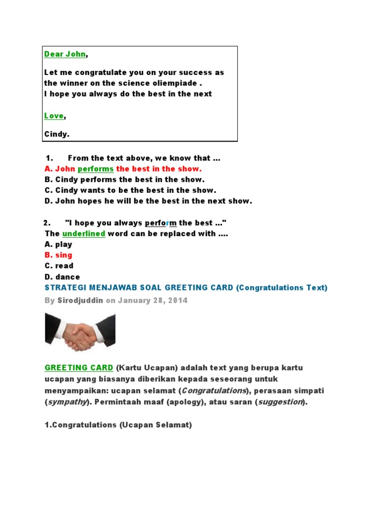 Savesave soal congratulation for later. Soal uh b inggris x. I'm very proud of you jawaban: Saat sesuatu yang baik terjadi terhadap teman, keluarga, rekan kerja seperti pada konteks pernikahan, lulusan, mendapatkan prmosi jabatan, pertunangan, kelahiran bayi. Contoh soal essay mid semester genap bahasa inggris kelas x sma dipertengahan semester ini. Congratulation cards / congratulations cards. Greeting cards atau kartu ucapan merupakan salah satu jenis text yang sering kali muncul pada beberapa tipe ujian. I would like to know what option is correct: You have been accepted by the most popular junior. 10 latihan soal greeting card jawabanya. Written by demi yurfina on saturday, november 8, 2014 | 7:53 am. Silahkan anda klik link tentang contoh contoh soal congratulation and compliment pdf yang ada di bawah ini. Berikut contoh bank soal tentang greeting card materi pelajaran bahasa inggris yang bisa digunakan sebagai ujian pembelajaran congratulations on your winning at the regional chess competition!